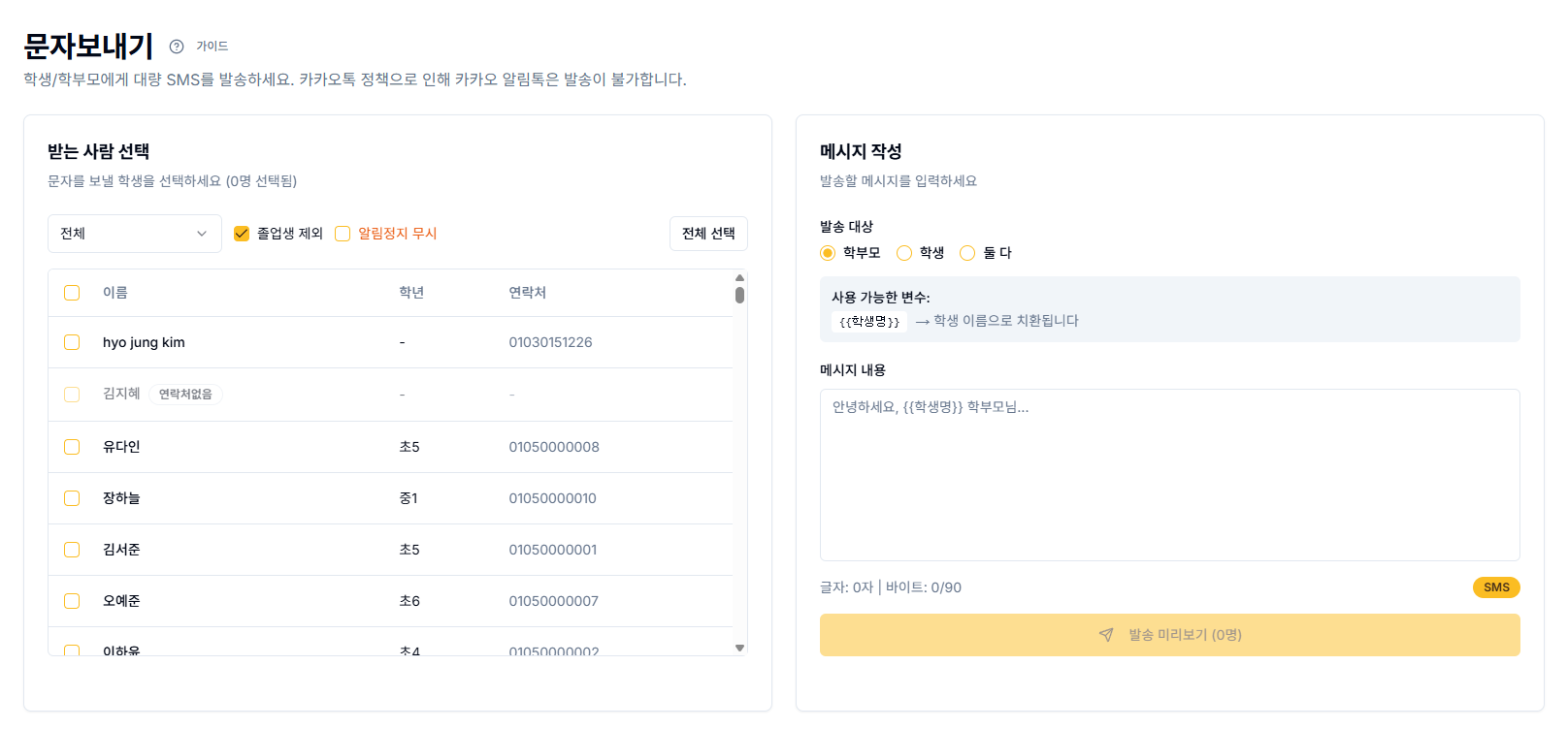 당연히 비용은 무료입니다! SMS 발송에 사용되는 비용만 부담하시면 되고, 까다로운 절차없이 바로 이용하실 수 있는데요. 수동 관리는 이제 내려놓으셔도 됩니다. 반복되는 행정 업무에 시간을 쓰기보다, 교육의 본질에 더 집중할 수 있는 환경을 만드는 것이 훨씬 중요한데요. 원장님의 하루가 달라지면 학원의 내일도 분명히 달라지지 않을까요? 운영을 조금 더 효율적으로 정리해 보고 싶으시다면, 한 번 사용해 보시길 권해드립니다.
