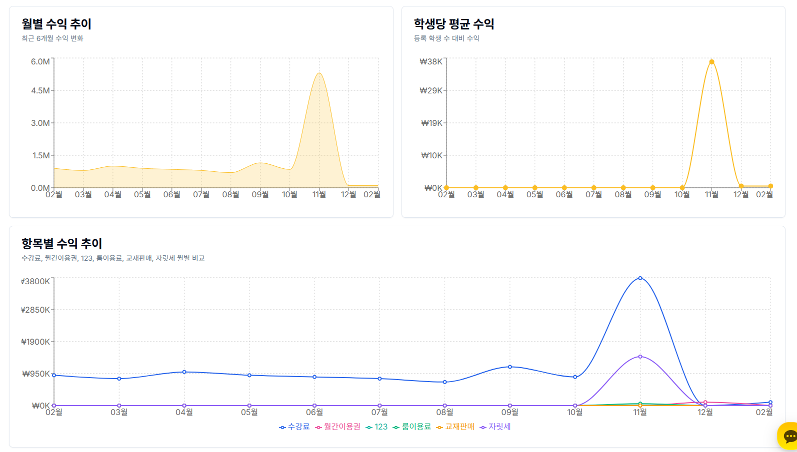 수납 관련해서도 마찬가지입니다. 자동으로 정리된 매출 통계와 미납 현황을 통해 이번 달 학원 운영 상태를 빠르게 파악할 수 있고, 필요한 의사결정도 더 명확하게 내릴 수 있는데요. 예를 들어 특정 반의 수강률이 줄어들고 있는지, 신규 등록이 늘어나고 있는지 등을 데이터로 확인할 수 있습니다. 숫자가 눈에 보이면 판단이 빨라지고, 운영에 대한 자신감도 달라지겠죠?