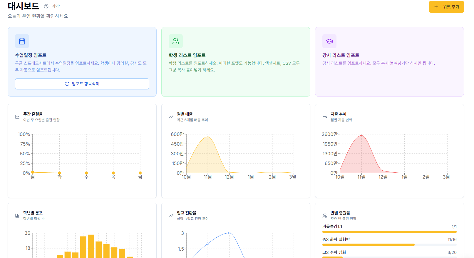 또한 이런 데이터는 학원의 방향을 잡는 데에도 도움이 되는데요. 어떤 반이 꾸준히 유지되고 있는지, 어떤 시간대에 학생이 몰리는지, 어떤 학생들이 결석이 잦은지 등을 파악할 수 있기 때문입니다. 이러한 정보는 단순히 기록으로 끝나는 것이 아니라 반 편성이나 수업 운영 전략을 세우는 데에도 활용될 수 있습니다.