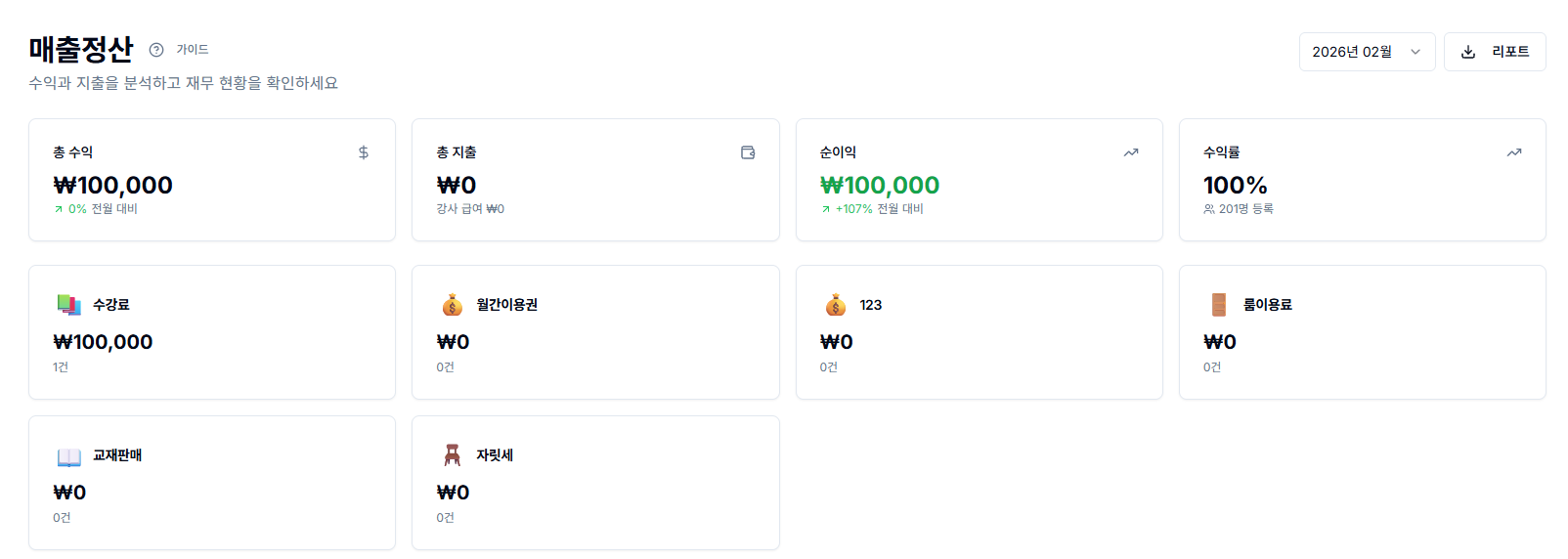 또한 학생당 수입 분석을 통해 회원 1인당 평균 매출을 확인할 수 있어, 재원 유지 전략이나 신규 회원 유치 전략을 세우는 데에도 도움이 되는데요. 그냥 "요즘 매출이 괜찮은 것 같다"는 감각적인 판단이 아니라, 수치로 비교하고 확인할 수 있기 때문에 운영의 방향성을 보다 명확하게 잡을 수 있습니다.