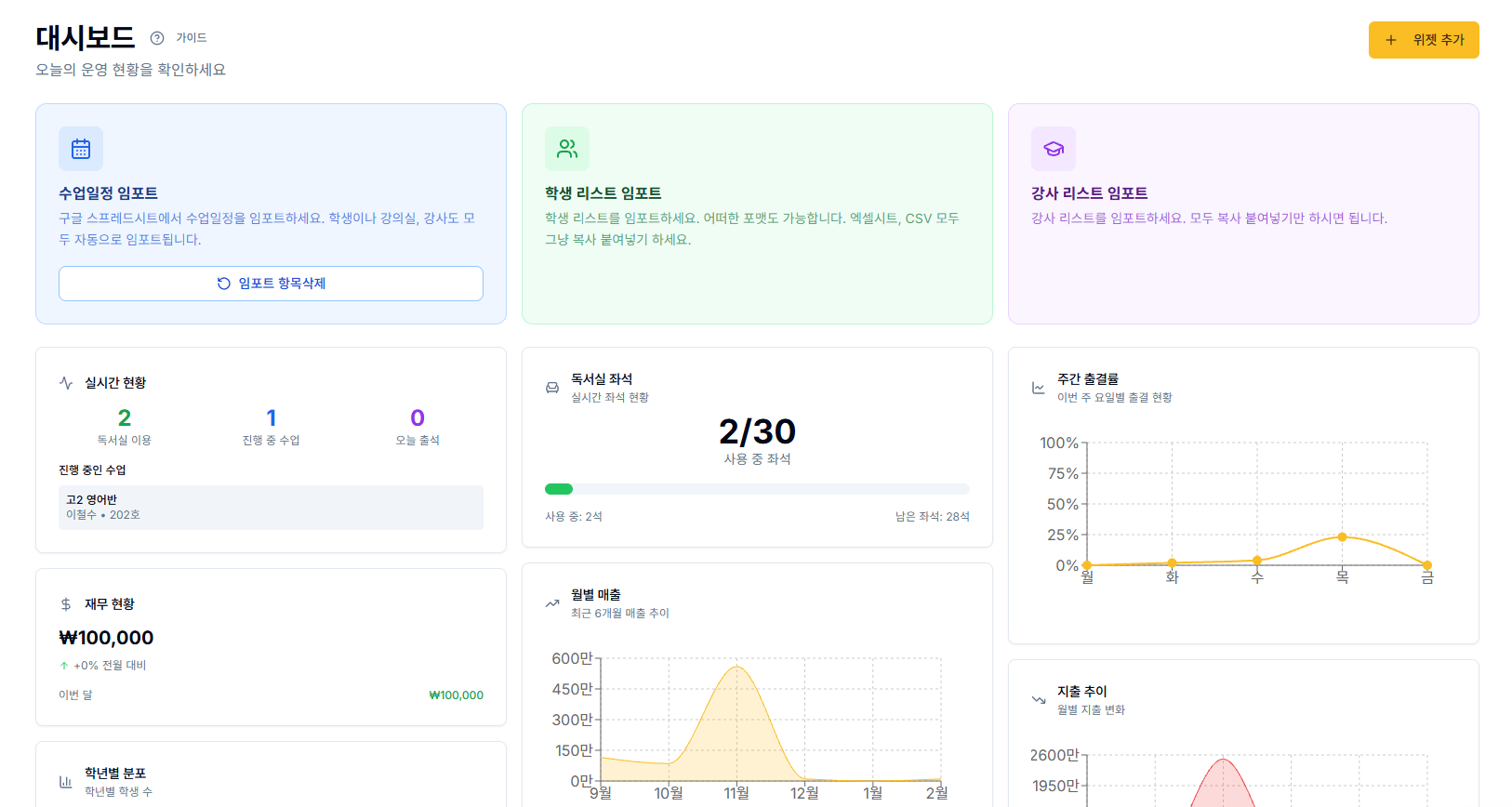 여기에 더해 통합 대시보드 기능이 운영 전반을 한 화면에 정리해 줍니다. 실시간 출결 현황, 좌석 사용률, 매출 추이, 상담 일정 등 주요 지표를 한눈에 확인할 수 있어 별도의 보고서를 만들지 않아도 현재 운영 상태를 즉시 파악할 수 있는데요. 바쁜 시간대에도 화면 하나로 전체 상황을 점검할 수 있기 때문에 의사결정 속도가 빨라지고, 관리의 정확도도 자연스럽게 높아집니다.