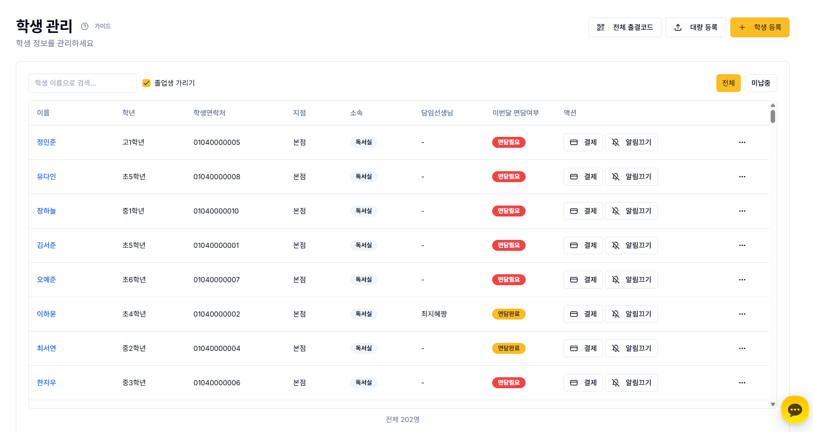 여기에 상단 검색창을 통해 학생 이름으로 빠르게 검색할 수 있고, 상태 필터를 통해 재원, 휴원, 퇴원 학생을 구분해 볼 수 있는데요. 학생 수가 많아질수록 이러한 필터 기능은 관리 효율을 크게 높여줍니다. 예를 들어 휴원 학생만 따로 확인하거나, 특정 학년 학생만 빠르게 조회해야 하는 상황에서도 몇 번의 클릭으로 정리가 가능하기 때문입니다.
