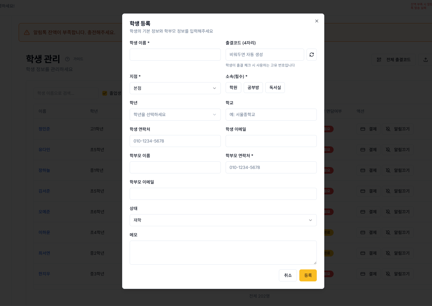 골드펜의 학생관리 기능은 신규 학생 등록부터 시작합니다. "학생 등록" 버튼을 클릭하면 이름, 연락처, 학교, 학년, 학부모 정보 등을 입력할 수 있는 폼이 열리는데요. 기본 정보가 체계적으로 정리되며, 이후 모든 관리의 기준이 됩니다. 이후 출결·상담·성적 관리와 자연스럽게 연결되는 구조이기 때문에 초기 입력 단계부터 운영의 틀이 잡히게 됩니다.