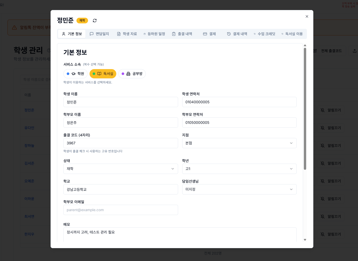 학생 카드를 클릭하면 상세 모달이 열리며, 학부모 정보, 수강 정보, 출결 내역, 성적 정보까지 한 화면에서 확인할 수 있는데요. 이 점이 특히 중요한데, 여러 메뉴를 이동하지 않고도 한 학생에 대한 전반적인 현황을 파악할 수 있기 때문입니다. 상담 중에도 화면 하나로 정보를 확인할 수 있어 응대의 흐름이 끊기지 않습니다.