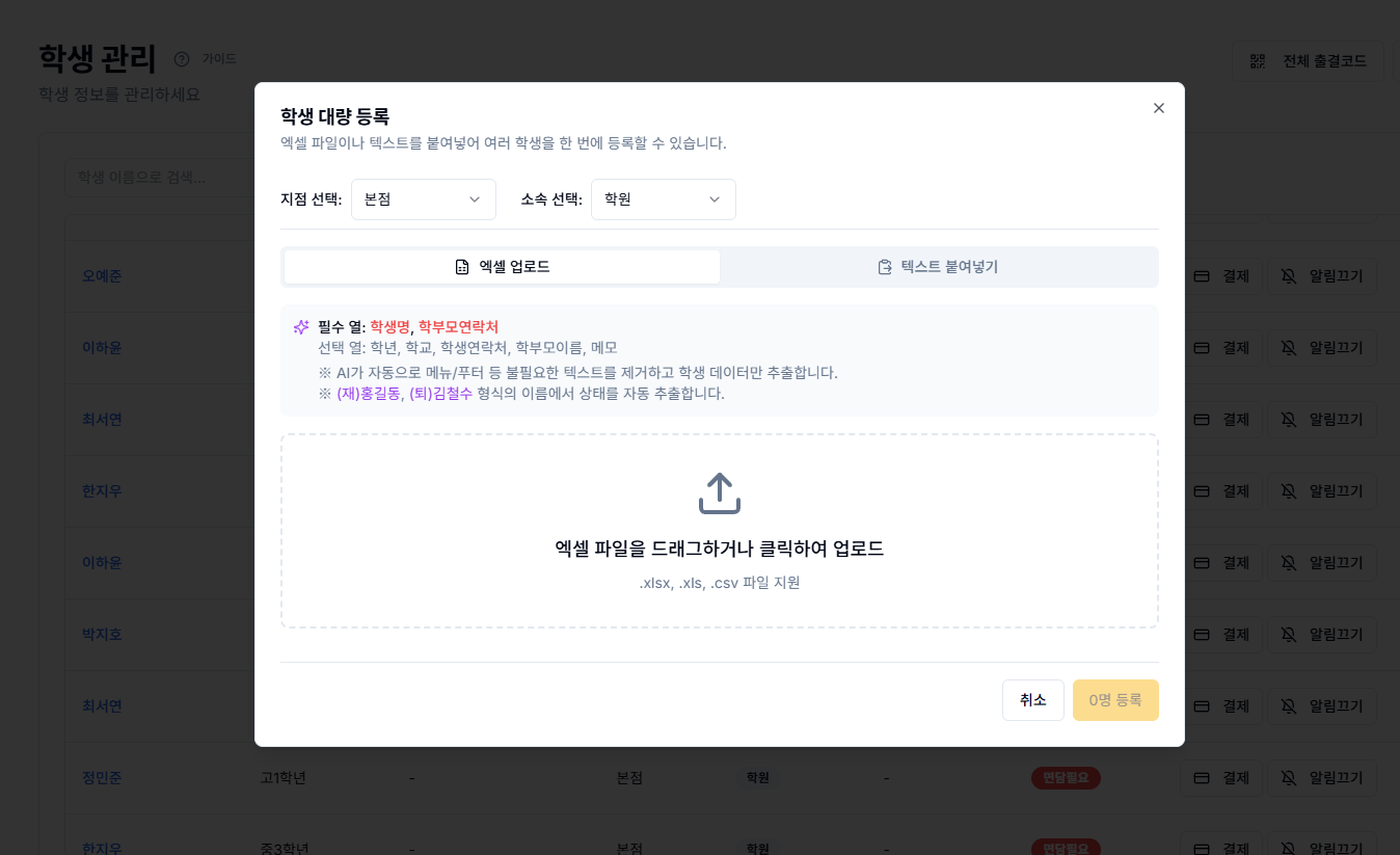 또한 대량 등록 기능을 통해 엑셀 업로드만으로 여러 학생을 한 번에 등록할 수 있어 신학기처럼 학생이 몰리는 시기에 특히 유용한데요. 템플릿을 활용하면 입력 오류를 줄일 수 있고, 초기 세팅 시간을 크게 단축할 수 있습니다.