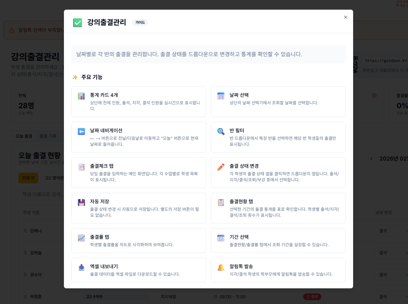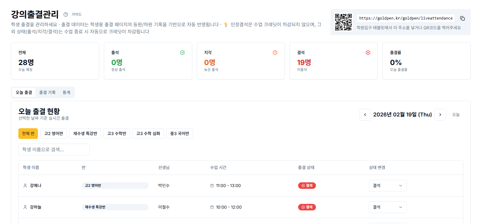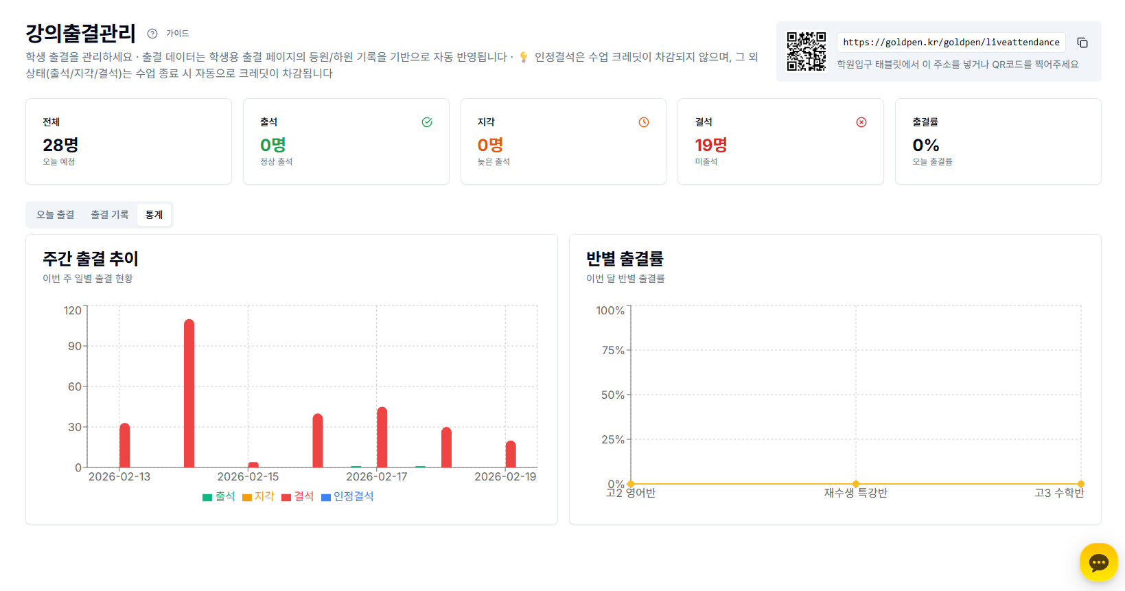 골드펜의 출결관리 기능은 날짜별로 각 반의 출결을 관리할 수 있도록 구성되어 있는데요. 상단에는 전체 인원, 출석, 지각, 결석 인원이 실시간으로 표시되어 현황을 즉시 파악할 수 있습니다. 여러 반을 운영하더라도 한눈에 전체 흐름을 확인할 수 있어 관리의 효율이 높아집니다.