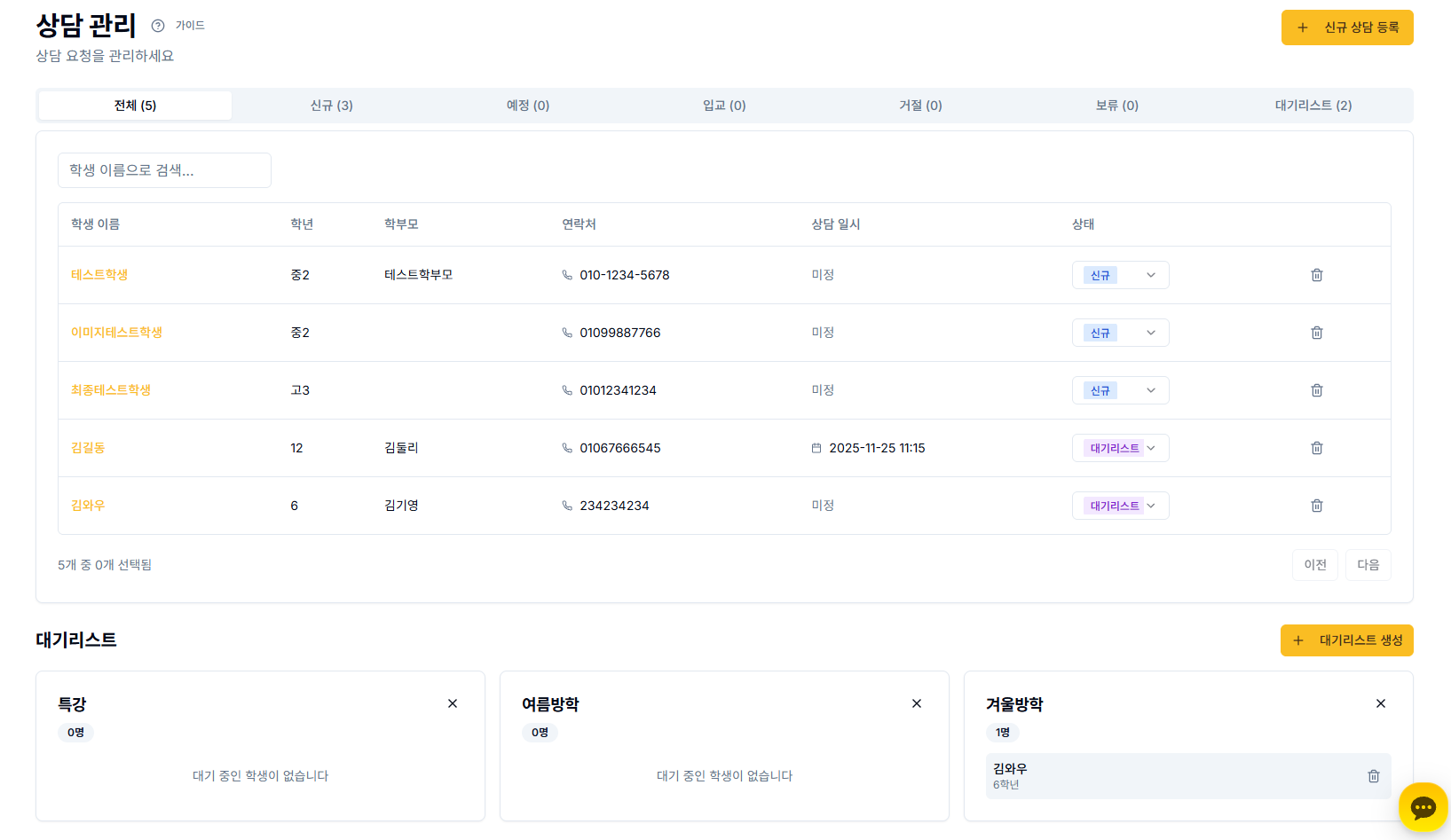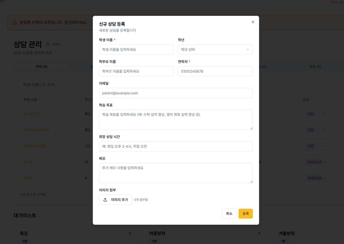 "상담 등록" 버튼을 통해 학생명, 연락처, 학교, 학년, 상담 채널, 관심 과목, 상담 메모를 입력할 수 있습니다. 상담 예정 일시를 설정하면 다음 상담을 예약할 수 있고, 상태를 등록대기 등으로 관리할 수 있는데요. 기록만 하는 것이 아니라, 진행 상태를 단계별로 관리할 수 있다는 점이 특징입니다.