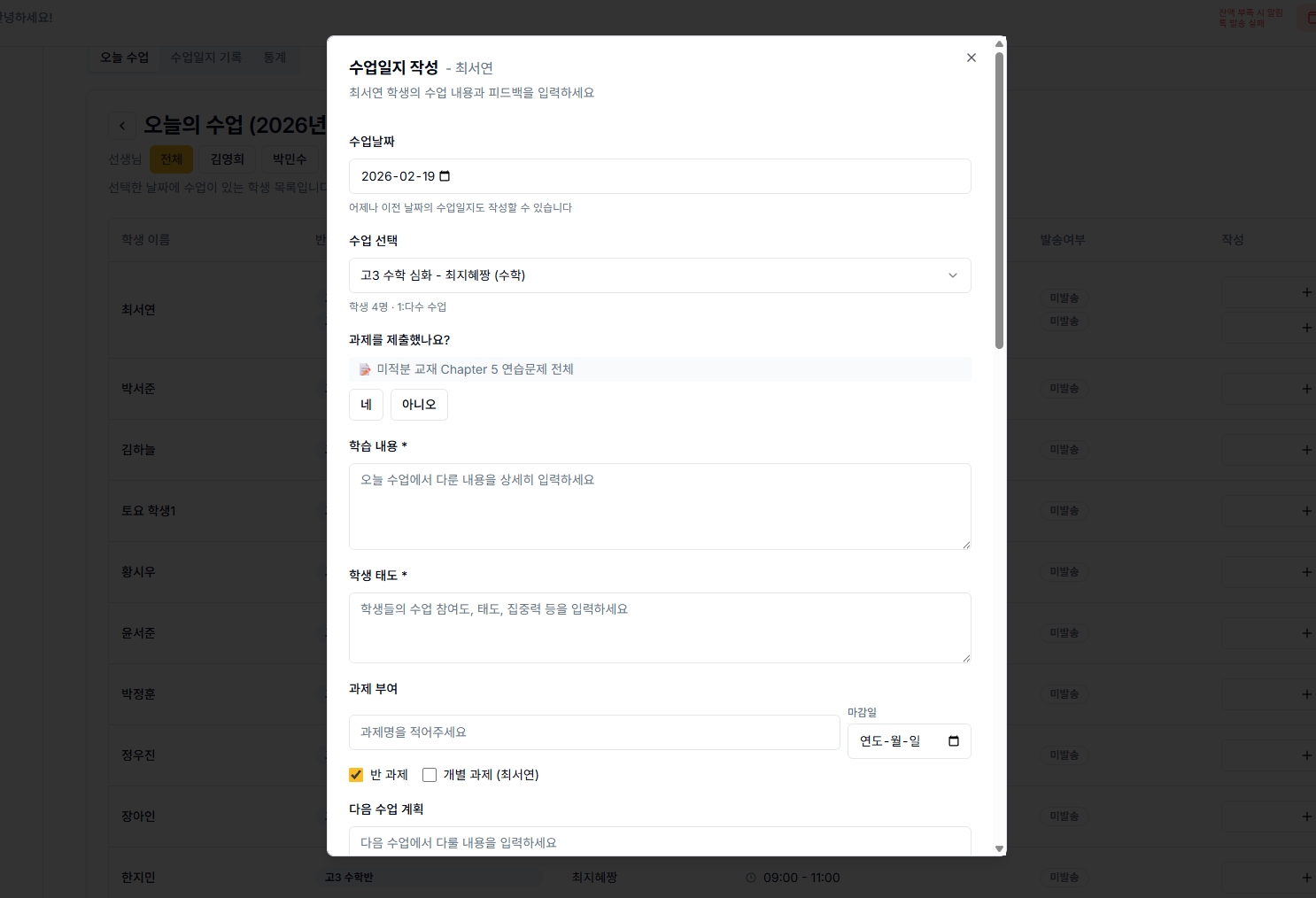 또한 일정한 형식으로 정리된 수업일지는 학원 전체의 관리 수준을 보여주는 지표가 되기도 하는데요. 학부모는 매 수업 이후 꾸준히 전달되는 체계적인 피드백을 통해 학원의 전문성과 성실함을 느끼게 됩니다. 이는 편의 기능을 넘어, 장기적인 신뢰 형성과 재등록 유지율에도 긍정적인 영향을 줄 수 있습니다.