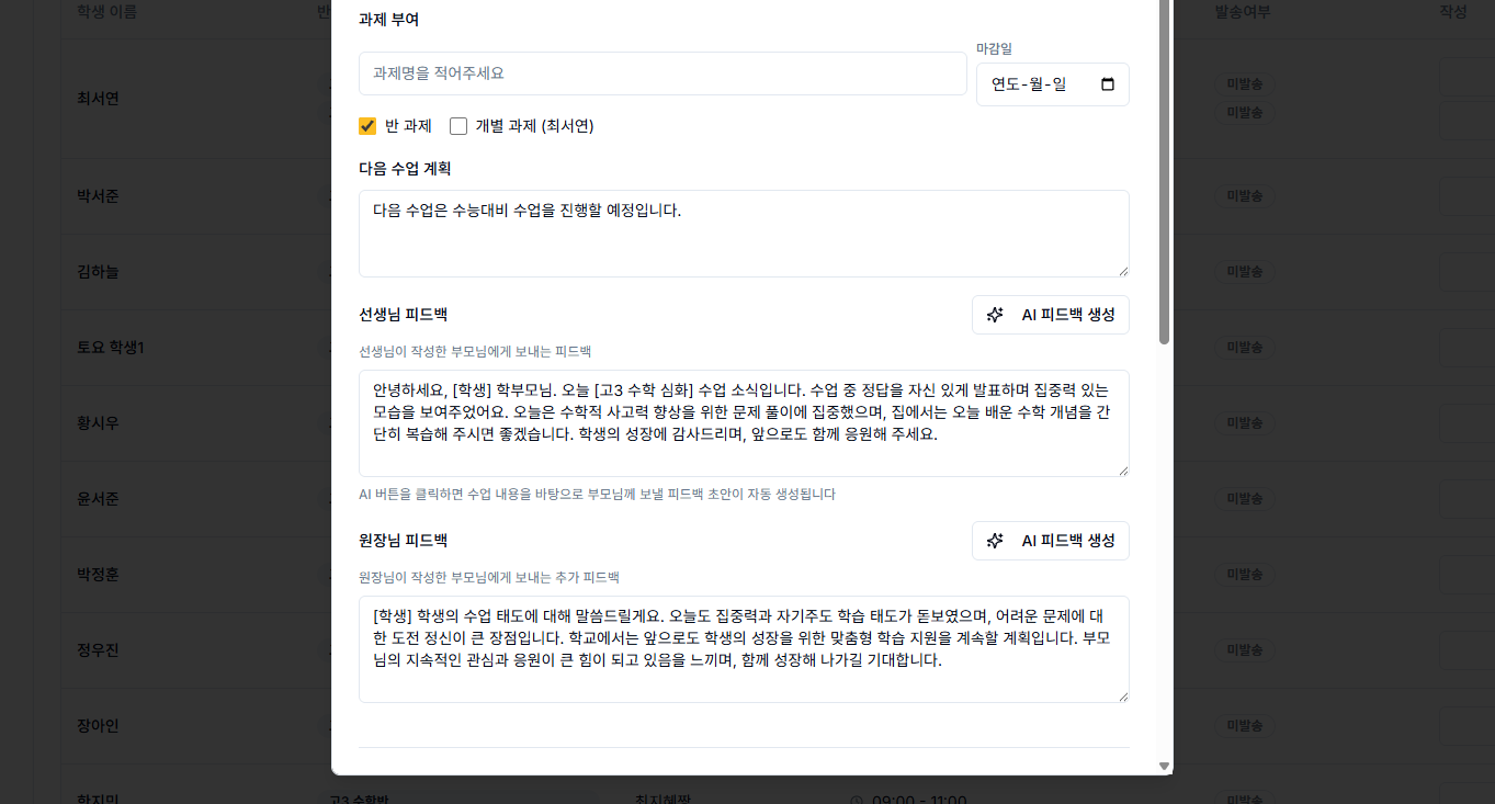 이는 단순히 정해진 문구를 반복하는 자동 메시지가 아니라, 실제 수업 내용에 기반한 맞춤형 정리 메시지라는 점이 특징인데요. 강사는 수업의 핵심 포인트와 학생의 이해도를 기록하는 데 집중하고, 학부모 안내는 보다 효율적으로 진행할 수 있습니다. 수업일지 작성 시간이 단축되면 강의 준비와 학생 개별 관리에 더 많은 시간을 투자할 수 있어 전체 수업의 질이 함께 향상될 수밖에 없습니다.