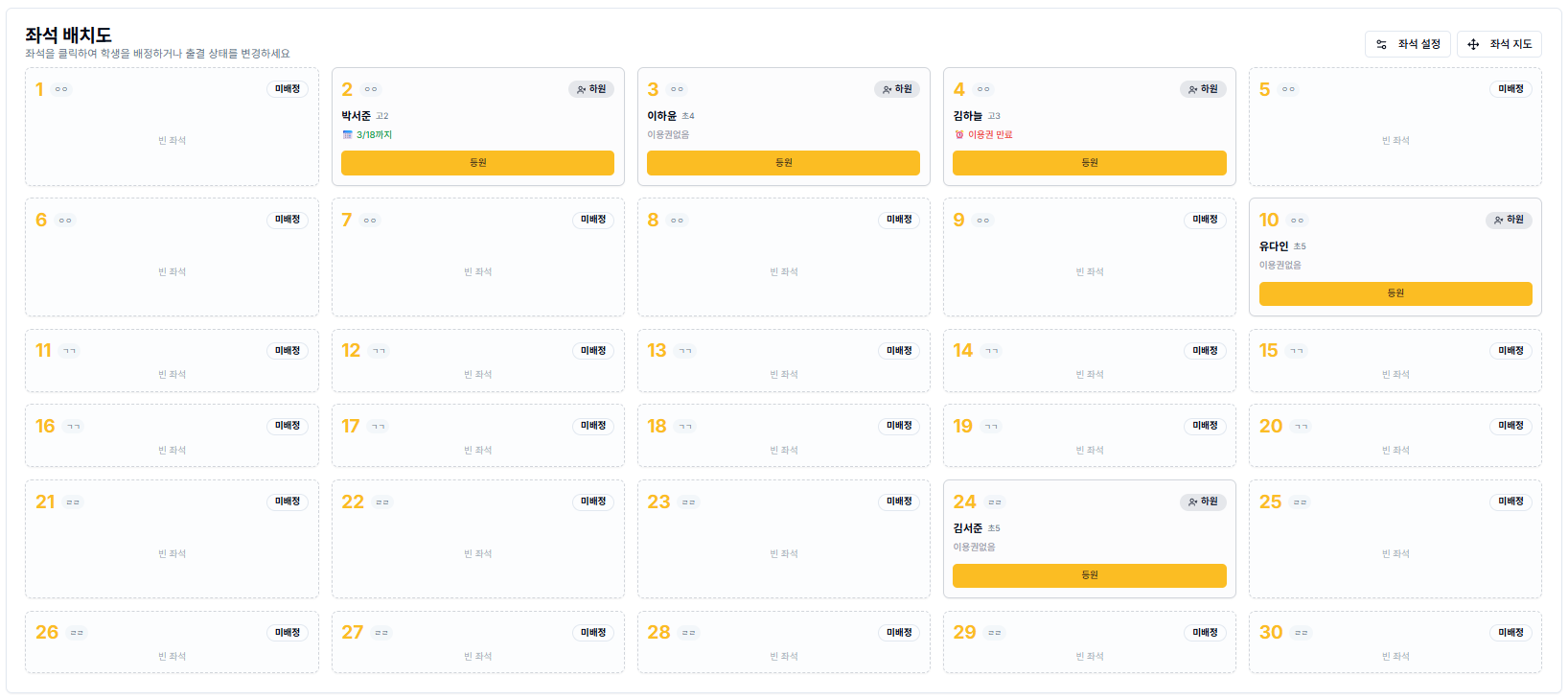 배치도가 완성되면 실시간 입퇴실·외출 현황이 자동으로 추적됩니다. 이용자가 입실하면 해당 좌석이 사용 중으로 표시되고, 퇴실하면 즉시 빈 좌석으로 바뀌게 되는데요. 이 모든 변화가 자동으로 반영되기 때문에 운영자가 따로 체크하지 않아도 좌석 현황이 항상 최신 상태로 유지됩니다.